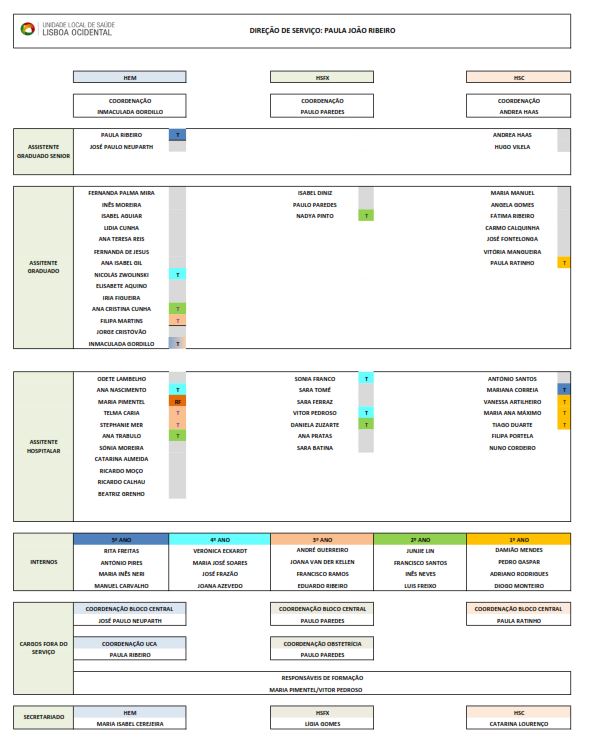 Diretor de Serviço: Dra. Paula João Ribeiro Coordenação Hospital de Egas Moniz: Dra. Maria Inmaculada Duran Coordenação Hospital de Santa Cruz: Dra. Paula Ratinho Coordenação Hospital São Francisco Xavier: Dr. Paulo Paredes Administrador Hospitalar: Dr. Sérgio Pedreiras Missão A nossa missão é prestar uma assistência clínica que se distinga pela qualidade e excelência dos cuidados. Um modelo organizacional eficiente mantendo o respeito pelos direitos dos doentes, monitorizando regularmente o desempenho, possibilitando a realização pessoal e profissional dos profissionais, acompanhado pela inovação tecnológica e investimento na formação. Atividade Assistencial O Serviço de Anestesiologia do Centro Hospitalar de Lisboa Ocidental (CHLO) desenvolve a sua atividade nos três hospitais que constituem o centro hospitalar. É composto por profissionais de elevado nível técnico, ético e humano. Com uma vasta história de sucesso, desenvolve atividade assistencial e formativa com elevados padrões de qualidade e segurança. As suas múltiplas áreas de intervenção repartem-se por: A par do trabalho assistencial, o Serviço de Anestesiologia tem um papel importante na formação pré e pós-graduada de internos de diversas especialidades. O Serviço de Anestesiologia dedica-se ao ensino pré e pós graduado. Colaboramos com a Universidade Nova de Lisboa – Faculdade de Ciências Médicas na formação pré graduada. O Serviço tem Idoneidade formativa atribuída pela Ordem dos Médicos para Formação Específica de Anestesiologia. A Unidade de Cuidados Intensivos tem, em conjunto com a Unidade de Cuidados Intensivos Polivante do Hospital de São Francisco Xavier, capacidade formativa para o ciclo de estudos especiais da Sub-Especialidade de Cuidados Intensivos. Desenvolve investigação clínica apresentando anualmente trabalhos em congressos nacionais e internacionais. Hospital de Egas Moniz - localização Localização: piso 2 Secretariado (Maria Isabel Cerejeira): 210 432 213 Email: Este endereço de email está protegido contra piratas. Necessita ativar o JavaScript para o visualizar. Hospital Santa Cruz - localização Localização: piso 1 Secretariado (Catarina Lourenço): 210 433 056 Email: Este endereço de email está protegido contra piratas. Necessita ativar o JavaScript para o visualizar. Hospital São Francisco Xavier - localização Localização: piso 4 do edifício 1 Secretariado (Lígia Gomes): 210 431 046 Email: Este endereço de email está protegido contra piratas. Necessita ativar o JavaScript para o visualizar. Direcção