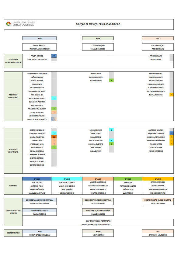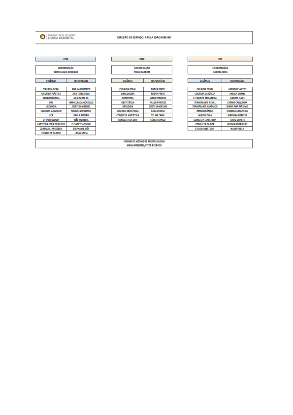 Diretor de Serviço: Dra. Paula João Ribeiro Coordenação Hospital de Egas Moniz: Dra. Maria Inmaculada Duran Coordenação Hospital de Santa Cruz: Dra. Paula Ratinho Coordenação Hospital São Francisco Xavier: Dr. Paulo Paredes Administrador Hospitalar: Dr. Sérgio Pedreiras Missão A nossa missão é prestar uma assistência clínica que se distinga pela qualidade e excelência dos cuidados. Um modelo organizacional eficiente mantendo o respeito pelos direitos dos doentes, monitorizando regularmente o desempenho, possibilitando a realização pessoal e profissional dos profissionais, acompanhado pela inovação tecnológica e investimento na formação. Atividade Assistencial O Serviço de Anestesiologia do Centro Hospitalar de Lisboa Ocidental (CHLO) desenvolve a sua atividade nos três hospitais que constituem o centro hospitalar. É composto por profissionais de elevado nível técnico, ético e humano. Com uma vasta história de sucesso, desenvolve atividade assistencial e formativa com elevados padrões de qualidade e segurança. As suas múltiplas áreas de intervenção repartem-se por: A par do trabalho assistencial, o Serviço de Anestesiologia tem um papel importante na formação pré e pós-graduada de internos de diversas especialidades. O Serviço de Anestesiologia dedica-se ao ensino pré e pós graduado. Colaboramos com a Universidade Nova de Lisboa – Faculdade de Ciências Médicas na formação pré graduada. O Serviço tem Idoneidade formativa atribuída pela Ordem dos Médicos para Formação Específica de Anestesiologia. A Unidade de Cuidados Intensivos tem, em conjunto com a Unidade de Cuidados Intensivos Polivante do Hospital de São Francisco Xavier, capacidade formativa para o ciclo de estudos especiais da Sub-Especialidade de Cuidados Intensivos. Desenvolve investigação clínica apresentando anualmente trabalhos em congressos nacionais e internacionais. Hospital de Egas Moniz - localização Localização: piso 2 Secretariado (Maria Isabel Cerejeira): 210 432 213 Email: Este endereço de email está protegido contra piratas. Necessita ativar o JavaScript para o visualizar. Hospital Santa Cruz - localização Localização: piso 1 Secretariado (Catarina Lourenço): 210 433 056 Email: Este endereço de email está protegido contra piratas. Necessita ativar o JavaScript para o visualizar. Hospital São Francisco Xavier - localização Localização: piso 4 do edifício 1 Secretariado (Lígia Gomes): 210 431 046 Email: Este endereço de email está protegido contra piratas. Necessita ativar o JavaScript para o visualizar. Direcção